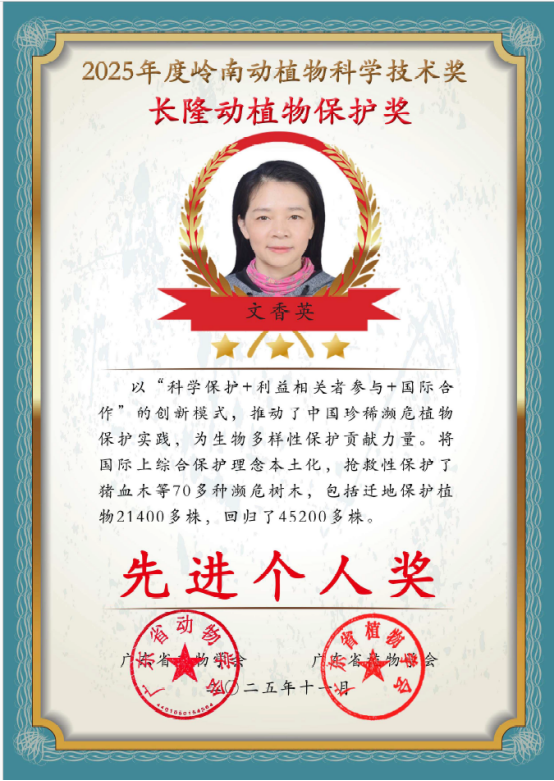 二十余年来,文香英一直从事野生植物保护工作,她以科学家的严谨、教育者的热忱和守护者的执着,深耕濒危植物保护与科普教育。她创新实践,守护濒危物种的生命线,她开创并实践了“科学保护+利益相关者参与+国际合作”的综合保护模式,为中国濒危植物保护提供了可复制的路径,取得的保护成果为《中国生物多样性红色名录》更新提供了重要参考、促进了政府部门对植物保护进一步重视并提升了中国在保护领域的国际影响力。她深入偏远山区,在孩子们心中播撒绿色的种子。她的足迹,深深嵌入中国植物多样性保护的脉络中。她系统总结了2008-2020年间开展的几十个典型保护案例(如伯乐树保护),出版专著《珍稀濒危木本植物综合保护》,为国内同行提供宝贵参考,同时在国际主流期刊发表论文介绍中国保护案例。