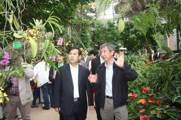 甘新一行随后还参观了水生植物专类园、展览温室群景区,来宾对华南植物园融合古今的园林造景、丰富多彩的植物种类和深厚的文化底蕴赞赏不已。甘新现场要求广州市有关部门与华南植物园合作,共建广州第一村,同时大力宣传华南植物园的历史文化及生态文明内涵。石奇珠书记希望华南植物园在“智慧新城”的水系建设中引入华南植物园的技术及物种,为天河区的生态文明建设服务。