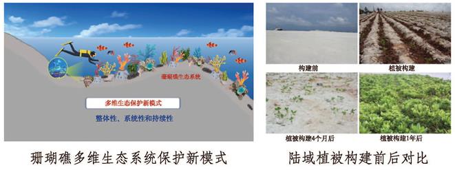 该项目面向南海生态岛礁建设的国家重大需求,针对岛礁珊瑚礁生态保护技术单一、种源匮乏和持续性差的国际难题,明确保护必需的框架结构,确定30种关键功能生物;突破22种关键功能生物繁育及底播技术,实现了生态保护种苗自给;发明基底稳固和礁基生物膜化技术,提高幼体变态附着率10倍以上;首创珊瑚礁物种多维、生境多维、结构多维、技术多维系统性保护新模式,研发功能菌剂、病敌害防控等养护技术,建成了世界最大珊瑚礁生态保护示范区。针对南海岛礁极端环境下的植被构建难题,研发了基质改良技术、50多种植被构建工具种和果蔬规模化繁育、养护及群落构建技术,形成岛礁绿化系统解决方案,建成示范区12万平方米,有力支撑了南海岛礁生态安全与可持续发展。该研究团队获中共中央、国务院等授予的模范集体称号。