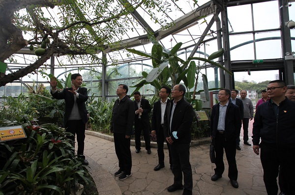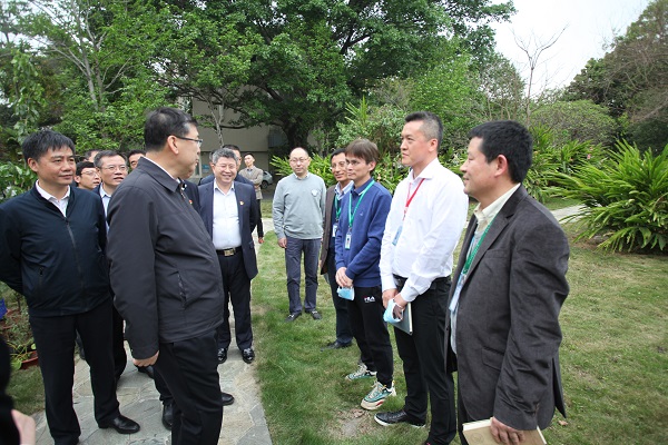 阴和俊首先参观了华南植物园的园林景观布局、植物配置及养护、科普设施投入等建设运营情况,园主任任海重点介绍了华南植物园近年来在迁地保护国家重点保护植物、经济植物利用、植物科学及生态科学普及方面的重要进展。在科研区,公共实验室主任徐信兰正高级工程师向阴和俊介绍了实验室发展历史、规模及其为园内外科研工作服务等情况;植物代谢组学实验室负责人杨子银研究员介绍了茶叶品质安全与调控方面的研究进展。在热带珊瑚岛植被建设盆栽苗群落展示区,任海主任介绍了珊瑚岛适生植物选育以及生态建设情况;在珍稀植物繁育实验基地,曾宋君研究员介绍了兜兰、朱顶红以及石斛新品种培育情况。阴和俊一边听取介绍,一边和科研人员亲切交谈,了解一线实际情况。