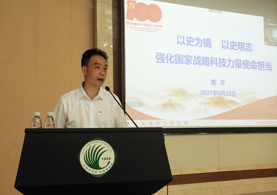 魏平以《以史为镜、以史明志,强化国家战略科技力量使命担当》为题,围绕“国家队”“国家责”讲专题党课。报告以国家战略科技力量的产生与发展、使命担当为主线,介绍了世界上主要国家战略科技力量建设发展概况;党的十八大以来,习近平总书记关于加强国家战略科技力量建设的重要论述、决策部署,以及对中科院提出的“两加快一努力”的要求。报告以中科院办院方针的6次调整及系列重大战略举措为脉络,回顾了中科院72年发展历程和华南植物园92年建设发展轨迹,阐述了新中国国家战略科技力量的创建、中科院及华南植物园作为国家战略科技力量的使命担当、历史成就和科学家精神。报告还介绍了未来一个时期中科院改革创新发展的总体要求,6个方面的工作举措和9项重点工作;华南植物园在推进共建国家植物园、申报国家重点实验室、南沙新园区建设、筹建南岭国家公园研究院、全园系统改革,以及2021年党建及党史学习教育等工作进展情况。魏平强调,全体党员和广大科技人员要从中国科学院及华南植物园的奋斗历程中汲取营养,启迪智慧,砥砺品格,进一步增强干事创业的信心和本领,办实事,开新局,自觉聚焦主责主业,主动肩负起实现高水平科技自立自强的时代重任,为使华南植物园重新进入国家科研机构“第一方阵”而努力奋斗。