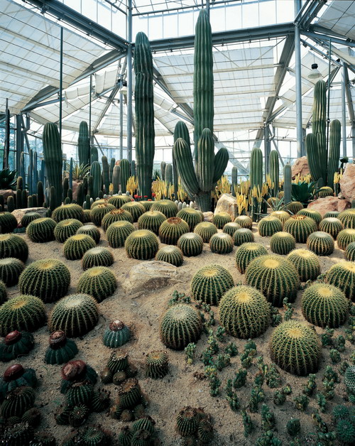 沙漠植物室占地689m2,最高达10.52m,延伸至室外的沙漠植物景观区面积约2000m2,共收集仙人掌类及多浆植物约300种。本区以仙人掌类和多浆植物的原产地进行分区展示,按照环形游览路线,依次分为美洲沙漠植物区、非洲沙漠植物区、亚洲沙漠植物区和澳洲沙漠植物区。