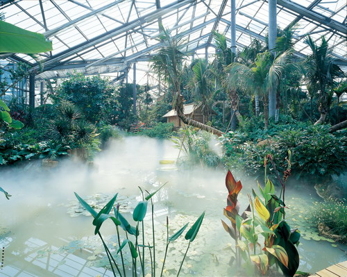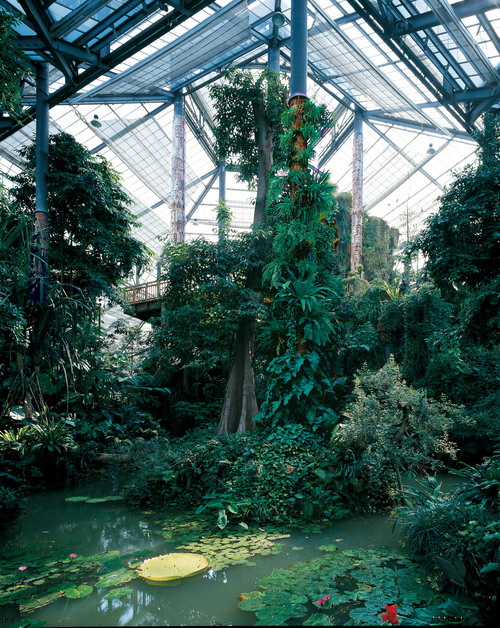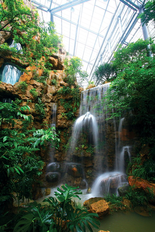 热带雨林室高27.4 m,占地面积7987m2。1000多种热带植物来自世界各地,姿态万千、色彩缤纷,营造了雨林奇观区、水生植物区、奇趣植物区、雨林文化区、雨林群落区、中心瀑布区和河谷雨林区七大主题景区,演绎了神秘的热带雨林世界。高耸云天的望天树、满腹毒汁的见血封喉、突降暴雨的雨树、载人如舟的王莲、酸尽甘来的神秘果、吐雾吞烟的吐烟花、粗壮神奇的面包树、饱含柴油的油楠、暗藏杀机的茅膏菜,济济一堂;绚丽的空中花园、多姿的独木成林、别有洞天的空心树、秀美的老茎生花、厚壮的板根,多姿多彩;汇集绞杀的傲视群雄、巨藤的密林穿梭、寄生的巧取豪夺、腐生的蝇蝇苟苟、附生的高枝攀附、共生的和谐共存,琳琅满目。