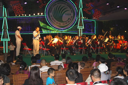 璀璨的灯光下,温室群景区光芒四射,远远望去犹如一颗璀璨的明珠,映衬着夜空格外闪亮。6月5日晚,别具一格的音乐会——中美文化艺术交流暨2010年华南植物园夏季森林音乐会在热带雨林室广场隆重举行。