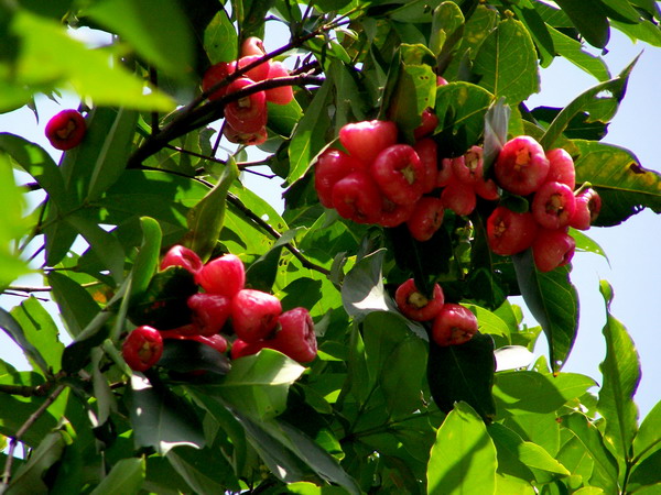 时近端午佳节,树姿优美的莲雾,果实挂满了枝头,三五聚生成串;有粉红、桔红、青、白等多种颜色,玲珑剔透,光洁诱人。端午时节多雨水,雨后,鲜嫩光洁的果实上珠光点点,微风中轻轻摇曳,引人心动。