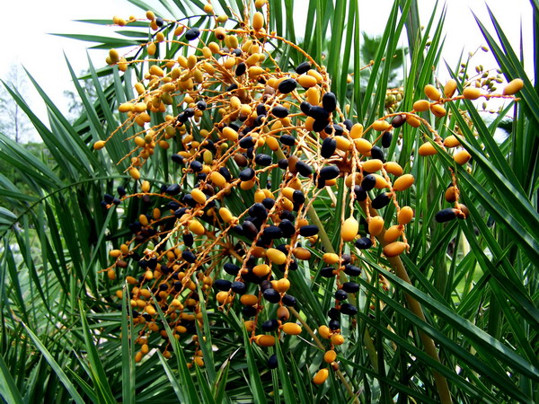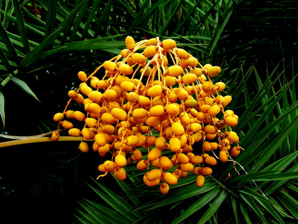 刺葵叶丛茂密丰满,翠绿鲜亮,羽状叶弯曲下垂,飘逸动人;七月份是观赏刺葵挂果的季节,成年植株挂果量大,成串聚生,硕果累累,橙黄色的果子在阳光照射下,金光闪闪,微风拂过,沙沙作响,成熟的果实已转为紫褐色,让人心醉。