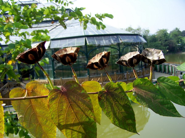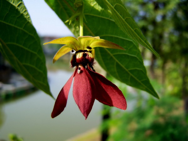 “玉鼠低眉随月舞,梦回聆听天籁音,夜光杯里昏黄尽,昂然径自向天歌”。虽说没有美丽、伟岸的树姿,也没有色彩怒放的震撼,孤植于水岸桥边的昂天莲,却有自然的趣味,欣赏昂天莲的花和果总能带给人诗意和激情。细心一些会发现,在夏日骄阳下,紫色花朵掩映在绿叶丛中,柔美娇羞,恬静安然,而果实却翹首枝头,倒锥形站立,一排排,气势昂然。花果相为比照,奇巧别致,意趣盎然。