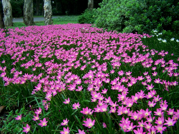 风雨花Zephyranthes grndiflora Lindl.是石蒜科玉帘属多年生草本植物,植株具地下鳞茎,叶线形,外观象韭菜,花较大,喇叭状,形似水仙,成年植株每个鳞茎都能开花,虽然花形较普通,但园林上常成片种植形成地被,盛花时红艳艳开成一片,观赏性很强。原产中、南美洲,现全国各地公园、庭园常有栽培。