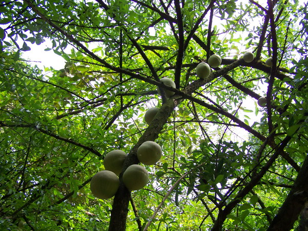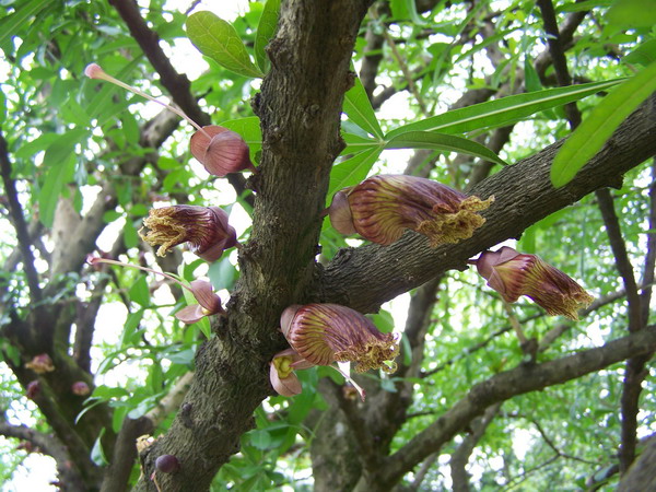 叉叶木(Crescentia alata H.B.K)是紫葳科常绿小乔木,株高3-6m,株型美丽;叶簇生于小枝上,小叶3枚,三叉状生长,形状像十字架,也叫十字架树;花单朵聚生于树干上,近无柄,花冠佛焰苞状,具紫褐色斑纹,花期10-12月,观果期可长达数月,原产南美热带地区,我国广东、云南等省有栽培,是值得推广种植物的优良观果园林树种