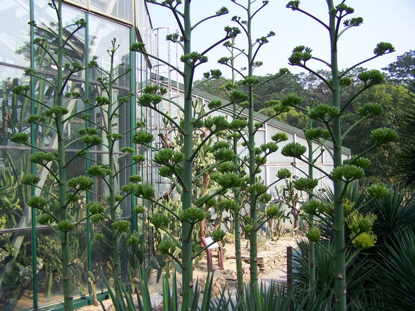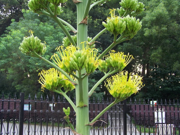 金边礼美龙舌兰植株匀称,叶莲座状生长,肥厚饱满,灰绿色,叶缘有金色条纹。通常几年甚至十几年才开一次花。开花时,花序梗如雨后春笋般迅速抽出,高可达2-3m。花芽从主茎上抽出到开花要一个多月的时间,一团团花从花序梗下端往上开,花浅黄色,多达数百朵,颇有气势,花期可持续约半个月。金边礼美龙舌兰这种过度张扬的开花过程往往消耗掉了植株大量的能量,有些植株花后会慢慢枯死。为了保证植物株成活,园艺上在花落之后应及时将花茎割掉,减少能量消耗,同时加强肥水管理以促进植株的恢复。