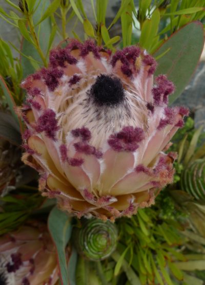帝王花(Protea cynaroides),山龙眼科(Proteaceae),又名普蒂亚花,是南非共和国的国花。其花形奇异,色彩艳丽,造型优雅,故脱颖于世界名贵花卉,号称花中之王,寿命达百年以上。