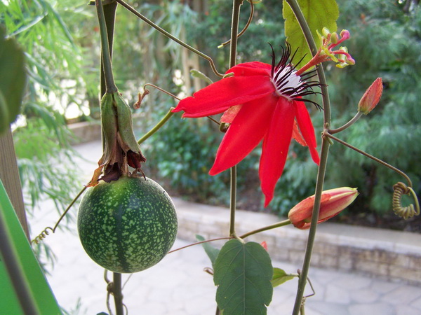 原产南美的洋红西番莲落户华南植物园的奇花异果温室近三年了,年年花开不断,纤细的藤蔓上挂满了花蕾,绽放鲜红色花朵,花呈放射状,极富层次感。今年国庆过后洋红西番莲第一次结了两个小果,在小小果实的点缀下,更具美趣。果实现在约有三华李大小,圆球形,颜色像小南瓜,青嫩光亮,非常可爱。