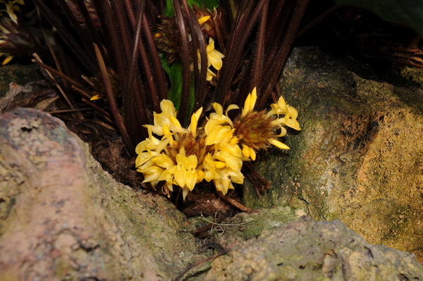 浪星竹芋(Calathea rufibarba Fenzl 'Wavestar')为肖竹芋属多年生草本观叶植物,也称波浪竹芋、浪心竹芋、剑叶竹芋。株高25厘米至50厘米,茂密丛生。叶基稍歪斜,叶片倒披针形或披针形,长15厘米至20厘米,叶面绿色,富有光泽,中脉黄绿色,叶缘及侧脉均有波浪状起伏,叶背、叶柄都为紫色。春天里的浪星竹芋不只用优美的叶片在谱写浪漫,还用花儿点亮春日。花序犹如从地面涌出,灿烂,奇美,明黄色的花朵着生于螺旋状的花萼中,显得明亮而艳丽,远望像点燃蜡烛的蛋糕。