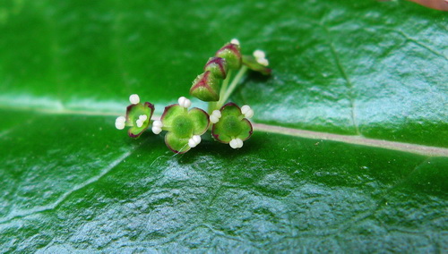 春天里的华南植物园是花的世界,放眼望去,姹紫嫣红、千姿百态、让人目不暇接。就在这百花丛中,总有一些是让人“不看不知道、一看还真奇妙”的稀罕玩意儿。这不,在温室群里的高山温室里就有那么一种。此花极不显眼,如果你是张着眼睛寻找像玫瑰或杜鹃那样的花,保证它在你眼前都会错过。可一旦发现它了,人们大多都会或高或低的“呀”一声,惊奇不已!原来它的花是开在叶片上,一般的花都开在枝头,这叶上开花却是极为罕见。花很小,凑近了看,倒也很是精致,数朵浅绿色的小花聚生在叶片的中央,每朵花上面点缀着三枚造型别致的白色花蕊,十分可爱。这有趣的植物就是:西藏青荚叶(Helwingia himalaica Hook.f.et Thorns.ex Clark.),人称“叶长花”。