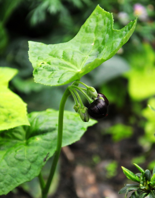 八角莲为小蘗科八角莲属多年生草本,分布于中亚热带至南亚热带广大地区,喜温暖潮湿的气候,常常野生于有泉水或伴有流水的林缘、山边。淡绿色的茎直立,横生的根茎粗壮,具明显的碗状节。单株一片叶,有时两片,盾状着生,有人据此称之为“独叶一枝花”或“一把伞”。叶片圆形,边缘有或多或少的浅裂或深裂(“八角莲”的名号便源于此),边缘具针刺状锯齿。其花苞着生在两个叶柄交叉处或独叶柄基处的上方,常常是数朵簇生,花苞下垂,开出紫红色花朵,宛若一个个小灯笼,虽不艳丽,倒也秀美,很耐看。
