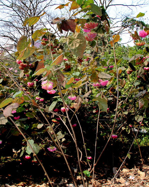 非洲芙蓉(Dombeya wallichii (Lindl.) Benth. & Hook.f.)是梧桐科非洲芙蓉属的常绿灌木或小乔木,开花时,常常的花轴上抽出等长的小花梗,可有20多个小花,悬吊而下,极像花球。在香港,人们称之为“吊芙蓉”,其他地方不少人称之为“百铃花”——可爱动听的名字。英语里,人们称之为“Pinkball”(粉红球)、 “Scarlet Dombeya”(绯红的非洲芙蓉)或“Tropical Hydrangea”(热带绣球花)等名。