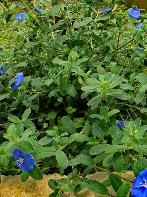 蓝星花(Evolvulus pilosus Roxb.)是旋花科(Convolvulaceae)土丁桂属多年生半蔓性常绿灌木,植株约30-60cm,茎叶密被白色绵毛,叶互生,长椭圆形,全缘;花腋生,花冠蓝色,中心白星形。全年开花,盛开时朵朵蓝花缀在枝叶中,格外清新脱俗。