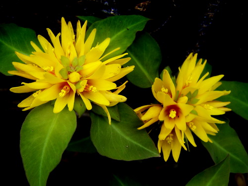 广西过路黄是一种颇具乡土气息的野生草本花卉,它没有牡丹的雍荣华贵,也没有桂花的清香扑鼻,花姿也很普通,但透出的色彩非常鲜亮,开花的季节,在野外有时绵延数十里的山地上到处都能见到它,朵朵黄色的小花点缀在荒坡草地上就像是黄色的染料泼在了绿色的画布上,星星点点。有时成片成丛,将春末的田野、山坡装点得分外浪漫芬芳。植物园温室种植的广西过路黄现正在开花,低矮的植株像地被植物一样贴生在岩石缝隙中,黄色的花朵簇生在淡绿色的叶片上,幽幽芳菲弥漫了整个空间,让温室都充满了灵性,充满了温馨和生机。