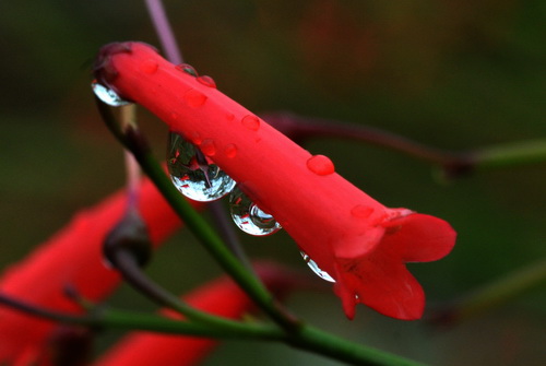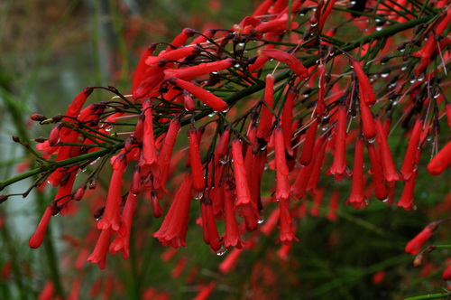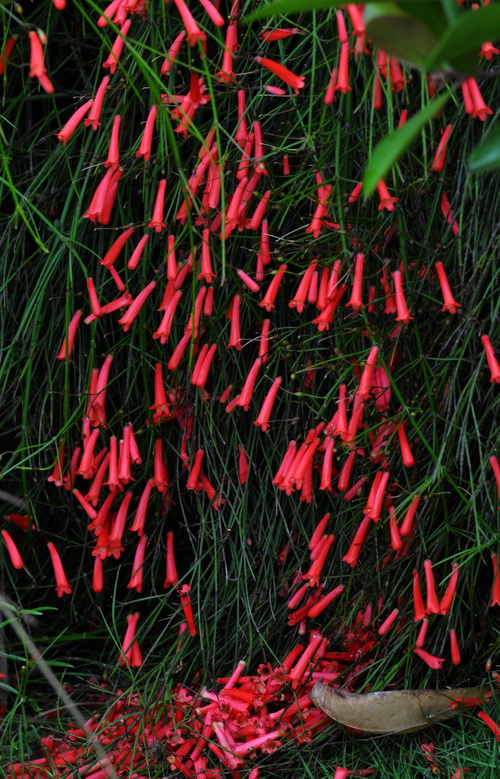 原来,此花名曰:炮仗竹(Russelia equisetiformis Schlecht et Cham.),乃舶来之物,自中美洲墨西哥漂洋过海来到中国,现在广东和福建等地有栽培。为玄参科(Scrophulariaceae)炮仗竹属直立灌木,别名:爆竹花、吉祥草等。株高1米左右,绿色枝茎纤细下垂,上面有纵棱。叶小,对生或轮生,已经退化成披针形的小鳞片,所以一般看不到叶片,形如“光棍树”。花儿鲜红,细小长筒状,小巧玲珑、曼妙可爱。盛开时长筒状的花朵成串的挂在下垂的枝条上,花色艳红,犹如细竹上挂满了红鞭炮,又像是圣诞树上那点点的彩灯。花期很长,几乎终年可以开放,尤其在夏季开得最为旺盛。此时的炮仗竹,那满身逼人的艳红如瀑布般垂下来,热烈得一塌糊涂,眼睛仿佛都要被点燃了,叫人不由得感叹:夏日不可无此君!