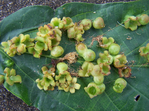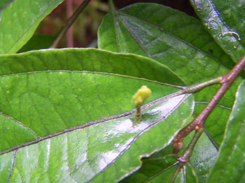 最近发现椴树科植物布渣叶(Microcos stauntoniana)的叶片上发了芽,还开出了怪异的花。椴树科植物布渣叶是广州地区常见的乡土植物,它的开花结果和普通的植物是一样的,怎么会叶上发芽开花呢,因此觉得奇怪。细察之下,终于发现其中的端倪。