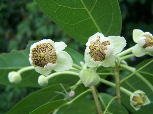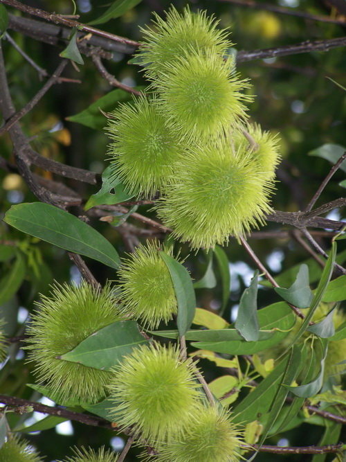 猴欢喜(Sloanea sinensis)是杜英科常绿乔木,树冠浓绿,树高可达20米,小枝褐色;叶聚生小枝上部,全缘或中部以上有小齿,狭倒卵形或椭圆状倒卵形,长5-13cm;花单生或数朵生于小枝顶端或叶腋,绿白色,下垂;蒴果木质,外被细长刺毛,卵形,5-6瓣裂,熟时红褐色;分布于广东、广西、贵州、湖南、江西、福建、台湾的丘陵低山地带,其木质坚重,可作材用,树皮、果壳可提制栲胶,是珍稀保护树种