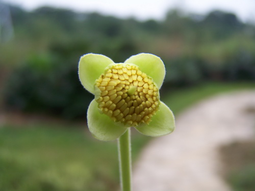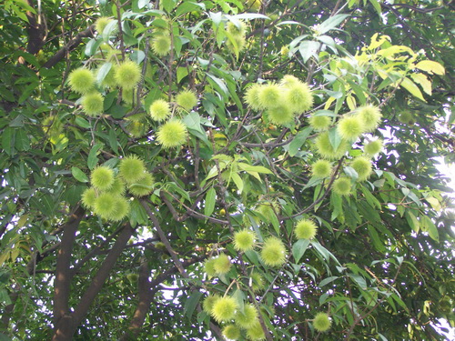 最近苏铁园有两棵大树上挂满了板栗状的球果,吸引路过的游客驻足观赏。粗心一点的人就把它当成板栗,也有人说是红毛丹。其实这种植物名叫猴欢喜,秋天果实成熟的时候,开裂的果荚掉在地上,果荚里面几颗褐色种子,不大,只有黄豆粒大小,有些发育不好的果荚还是空的,和板栗相差很大。