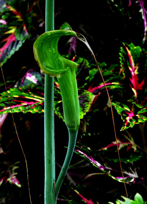 春天,一个生长季中仅有的一枚营养叶从隐藏在地下的扁球形块茎顶部生出,长长的圆柱形叶柄挺立在地上,在叶柄顶部,放射状地排列着几片至二十几片披针形的小叶片,如同一把从地面上撑起的绿色小伞。初夏,肉穗般的花序由叶柄下部伸出,在白色或紫色条纹的淡绿色佛焰苞的围护下,犹如一个神秘的隐士。初秋,原本直立的雌花序变得弯曲下垂,众多鲜红色的小浆果在果序上排列得密而有序,看上去有些像农家屋檐下悬挂的玉米棒子(有的地方称为“包谷”),只是颜色不是金黄而是鲜红,十分诱人,其俗名“蛇包谷”便是源于此。