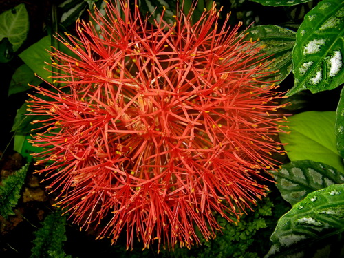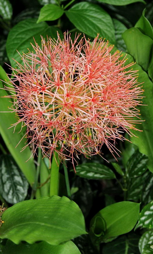 网球花(Haemanthus multiflorus),别名火球花、网球石蒜,是石蒜科(Amaryllidaceae)网球花属多年生草本球根花卉。在我国常见的同属“兄弟”还有虎耳兰(Haemanthus albiflorsu)、绣球百合(Haemanthus katharine)等,都具有很高的观赏价值。网球花具有扁平球状鳞茎,春末随着温度上升,叶子从鳞茎上部的短茎抽出,条形。当叶片达4-5片时便抽生花柱,花柱下面有淡绿色的佛焰苞。球状伞形花序顶生,上面有几十至上百朵花序组成,花为鲜红色,雄蕊长于花被,花药黄色,看去四射如球。每年只开花一次,花期集中5-7月,一个花球只能持续l0天左右,花谢后结圆形浆果。