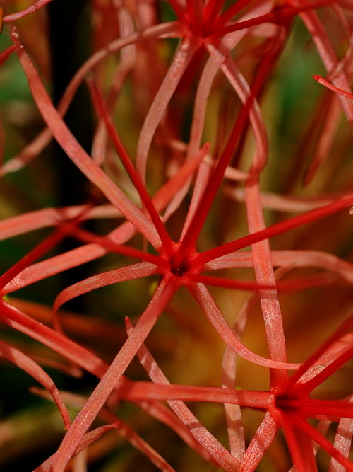 网球花,形如其名,顶生的花茎上密集近百朵小花,嫣红的小花朵呈球形排列,形成一个浑圆可爱的“大火球”。被针型的花瓣伸展开来,交错编织,就像舞台上可爱的精灵手拉着手悬空表演,看来时下最火的“杂技师”非它莫属了。