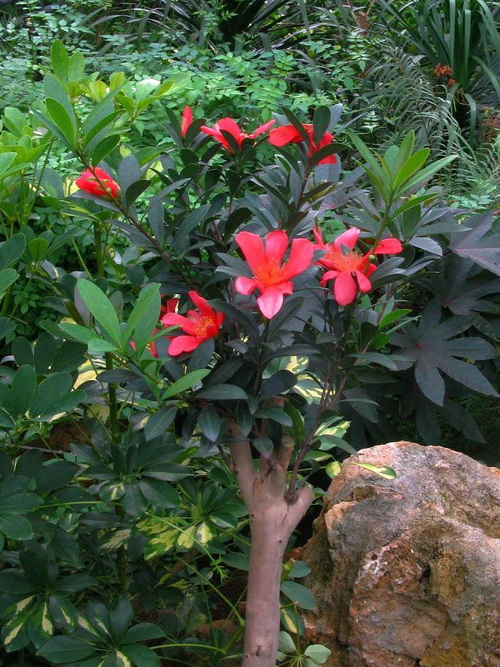 杜鹃红山茶(Camellia azalea )属于山茶科山茶属植物常绿小乔木,其叶片浓绿色,狭长倒卵形,边缘和叶面光滑,厚而有革质;花朵顶生或腋生,花瓣肉质较厚、呈长条状、鲜红色、花药金黄色、单瓣。杜鹃红山茶是一个奇异特殊的山茶原种,比普通的山茶花具有更多的特殊性。首先是叶片,我们一般看到的茶花,叶片边缘大都有明显的锯齿,而杜鹃红山茶的叶片边缘是全缘的,没有锯齿,十分光滑,形状、密度与杜鹃花十分相似,因此便有了“杜鹃红山茶”的名字。其次是花期,通常茶花的开花期从10月到来年4月,花期长达半年,没有在夏天开花的茶花,而杜鹃红山茶的盛花期在6月到11月,即使在炎热的夏季,依然满树红花,十分娇艳,如果栽培得好,一年四季都可以开花,因此也有“四季茶花”的别称。再次是抗逆性强,茶花常常被人们说成是怕冷、怕热、怕病虫害的娇气的花卉。可是杜鹃红山茶是抗逆性较强,它不仅在夏天开花,而且能忍耐-5℃,在长江以北的部分地区能露天栽培。因此杜鹃红山茶是一种很值得鼎力推广的园林绿化树种。