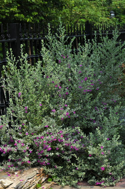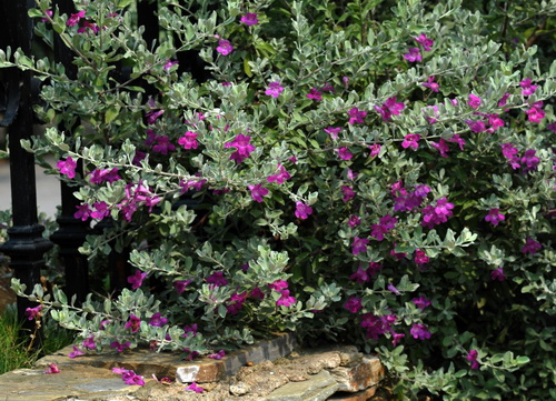 一朵朵紫红色的小花,衬着披满银灰色绒毛的叶片和幼嫩枝条,白里透着红,十分抡眼,令人一睹难忘!它,就是红花玉芙蓉(Leucophyllumfrutescens (Berland.) I.M.Johnst.)。因其形似菊科的芙蓉菊、花色紫红而得名。
