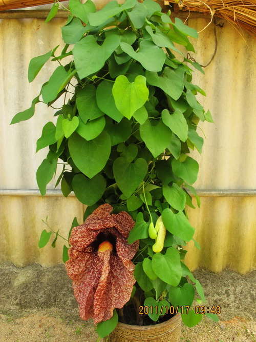 巨花马兜铃(Aristolochia gigantea Mart. & Zucc.)隶属马兜铃科(Aristolochiaceae)木质藤本常绿植物。老茎粗糙,嫩茎光滑无毛,叶互生,卵状心形,全缘,顶端短锐尖,基部心形,具叶柄;单花腋生,花被1片,基部膨大如兜状物,其上有一缢缩的颈部,顶部扩大如旗状,布满紫褐色斑点或条纹,长约40cm、宽约25cm。花期6-11月。