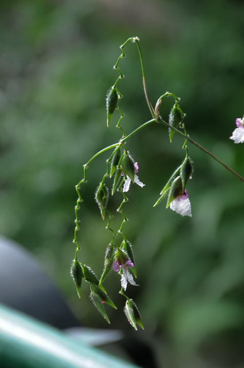 垂花水竹芋细丝状的花亭,一根根高高的挺出叶面,延伸出植株2倍高度。蝶状花朵倒挂在之字形的花梗下,在微风中轻轻晃荡,姿态飘逸,像身手不凡的杂技师在做高空舞蹈。