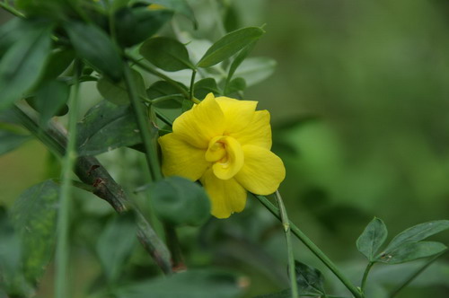 云南黄素馨(Jasminum mesnyi Hance),木犀科(Oleaceae)素馨属(Jasminum)。其枝细长而弯垂,茎四棱形,叶对生,三出复叶,花单朵腋生,花冠黄色,为半重瓣,是我国的特有植物。早春花叶同放,叶丛翠绿,花色金黄,黄绿相间,惹人喜爱,花期2~5月,果期8~11月。它的老祖宗生长在我国的西南部大山和峡谷,生性粗放,适应性强,易于栽培,因此又称之为野迎春。别以为它出生粗野就难以登大雅之堂,近年来其以清新而喜庆的形象赢得了人们的喜爱,其园林绿化的功能也渐渐被园丁们挖掘,成为了迎春新秀。