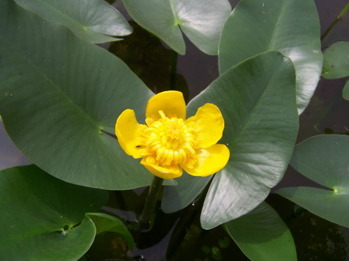 萍蓬草(Nuphar pumilum)是睡莲科(Nymphaeaceae)萍蓬草属多年生浮叶型水生草本植物,叶生于根茎先端,飘浮水面,有长柄,叶片椭圆形或卵形,质厚,长12-17厘米,宽7.5-10厘米,表面绿色,滑涧有光泽,叶背面紫红色,密被细毛;花黄色,直径2.5-3.5厘米,花瓣多数,甚短小,果实长卵形,具宿存的柱头及萼片;花期4-8月,果期7-9月。萍蓬草生于湖泊沼泽中,分布于广东、福建、江苏、浙江、江西、四川、吉林、黑龙江、新疆等地,日本、俄罗斯的西伯利亚地区和欧洲也有分布。园林上常用于池塘水景布置,与睡莲、荇菜、鸢尾等植物配植,形成绚丽多彩的水体景观。