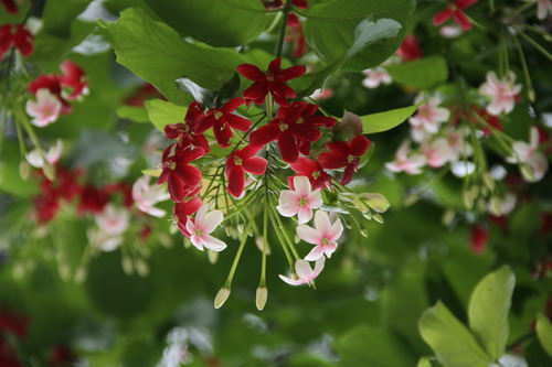 爱美的女孩儿一天换两三套衣服,爱美的花儿则是数天容颜三变! 使君子的花,在夜晚初开时为白色,渐渐地变成淡红,翌日由淡红而鲜红,完全开放后红花就会向下低垂。