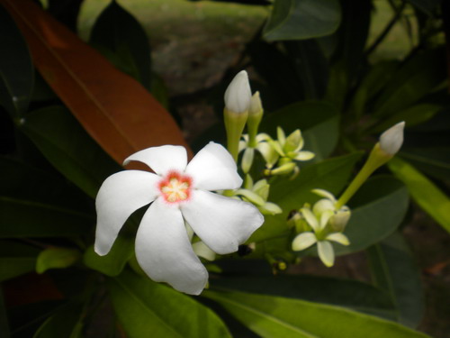 海杧果(Cerbera manghas L.)别名黄金茄、牛心荔。花冠白色,中央粉红色,雄蕊着生花冠筒喉部。夜晚,淡淡的茉莉香味吸引着甲虫为其授粉。海杧果生于海滨湿地或低海拔红树林,在野外树高可达12m。果实先绿后粉,再变为紫红并最终为黑色,椭圆形或球形,内果皮木质或纤维质。因果实像芒果而得名。但其实它和芒果没有亲缘关系,芒果是漆树科植物,而海杧果却是夹竹桃科的常绿乔木。在海边,果实成熟后就落到海里浪迹天涯,寻找安身之处。当它最终靠岸着陆时,往往只剩一层纤维包围着依然硬实的种子,更便于它们发芽扎根。