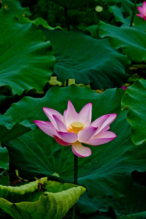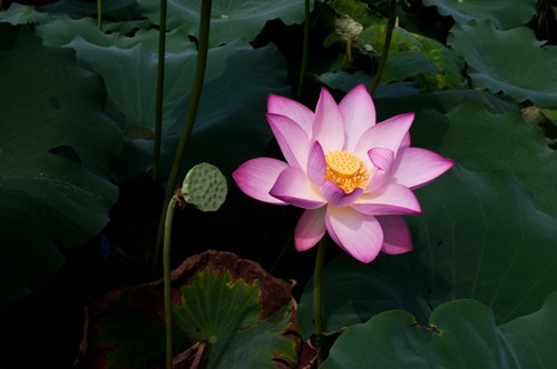 荷花,又名莲花,属睡莲科多年生水生草本花卉。地下茎长而肥厚,有长节,叶圆形,高出水面。花期6~9月,花单生于花梗顶端,花瓣多数,嵌生在花托穴内,有红、粉红、白等多种颜色。荷花全身皆是宝,其根状茎叫藕,种子叫莲子,皆可食用。藕、藕节、叶、叶柄、莲蕊、莲房可入药,能清热止血;莲心有清心火、强心降压之效;莲子有补脾止泻、养心益肾等强壮作用。