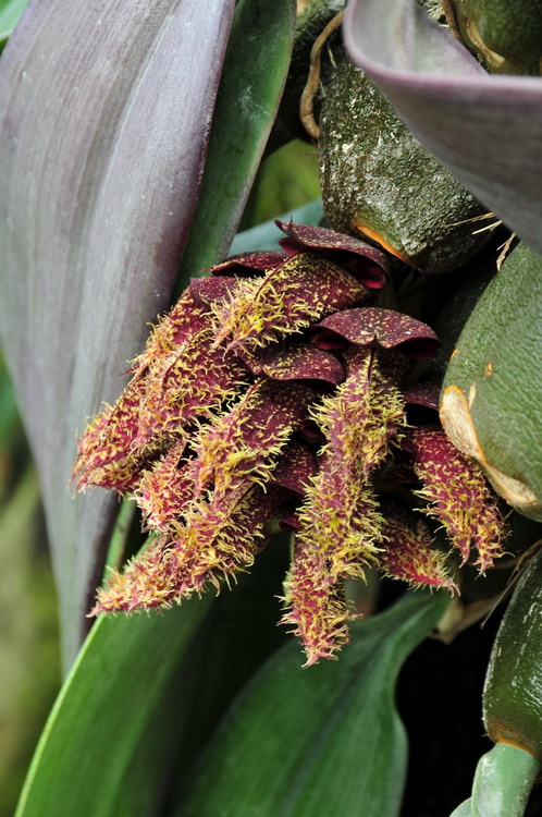 领带兰(Bulbophyllum phalaenopsis J.J.Sm.)为兰科石豆兰属的珍稀草本植物,大型的附生种类。假鳞茎圆形,顶生1叶;叶片长可达1.2米,宽如象耳蝴蝶兰,下垂,远观像系于绅士颈部的领带。夏秋季从假鳞茎基部长出奇异的短花序,每个花序着花15-30朵,绽放约10天;花管状,密集,表面具乳突,里面光滑鲜红色。花释放浓郁的带腐肉味的香气以吸引绿头苍蝇和腐尸甲虫传粉。