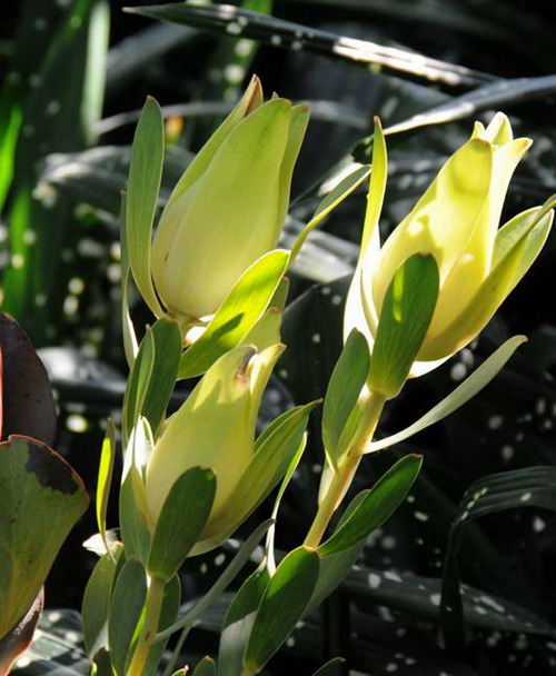 帝王花家族系列中的木百合跟我们所熟悉的百合花毫无血缘关系,这只是它当年踏入香港领土时的叫法。实际上,它是山龙眼科木百合属(Leucadendron)植物的统称。由于俏丽奇特的外形与郁金香有些相似,所以也被人们称为非洲郁金香。盛开中的木百合,亭亭玉立、亦花亦叶,其花形秀丽、清纯,有亮黄、紫红及绿等多个花色。由于花形奇特,深受市民特别是花艺爱好者的喜爱。它的观赏点在于它簇生的叶片和多色的苞片。因此,在众多的高端的花卉花艺展示中总少不了其玲珑多变的身影。