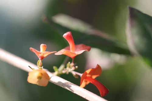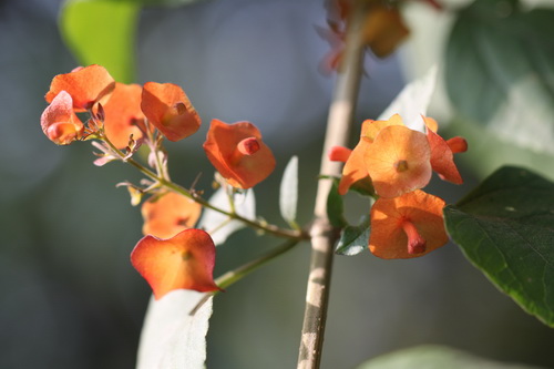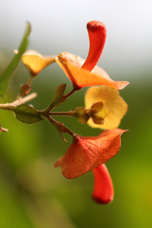 冬红(Holmskioldia sanguinea Retz.),马鞭草科(Verbenaceae)冬红属植物,常绿灌木,高3-7米;小枝四棱形,聚伞花序常2-6个,每聚伞花序有3花,中间的一朵花柄较两侧为长,花萼红色,由基部向上扩张成一阔倒圆锥形的碟,直径可达2厘米,边缘有稀疏睫毛,网状脉明显,甚为奇特;花冠红色,在枯黄的冬天里煞是惹人喜爱。花期:冬末春初。