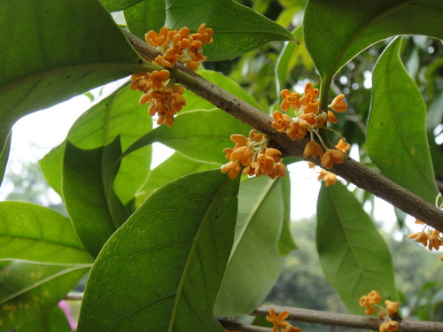 桂花是常绿灌木或小乔木,为温带树种,树高3-15米。花生叶腑间,每一个花蒂上能开出四五朵或六七朵花儿,每片花瓣呈椭圆形,中间还有两颗比小米粒还小的花蕊,形小,花簇生,有乳白、黄、橙红等色,花期9—11月,果期次年3—4月。其品种有金桂、银桂、丹桂、月桂等。它的核果椭圆形,熟时紫黑色。桂花是中国传统十大花卉之一,是集绿化、美化、香化于一体的观赏与实用兼备的优良园林树种。桂花芳香,能提取芳香油,制桂花浸膏,可用于食品、化妆品,可制糕点、糖果,并可酿酒。桂花味辛,可入药,有化痰、止咳、生津、止牙痛等功效。