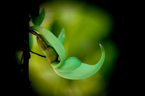 翡翠葛(Strongylodon macrobotrys A. Gray)又名碧玉藤,蝶形花科碧玉藤属木质藤本。花序悬垂,盛放时宛如一串串栖息于藤中林下的小鸟,生机盎然,惹人怜爱。花碧玉色透蓝色光泽,在阳光的照耀下,如翡翠般晶莹剔透,美得摄人心魄。含苞的酷似翡翠象牙,盛开的如同翡翠雕琢而成的金刚鹦鹉的喙,弯弯上翘的龙骨瓣甚张扬。