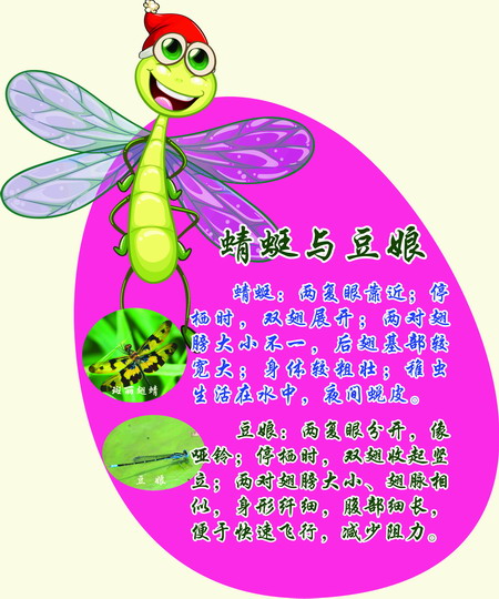 蜻蜓:两复眼靠近;停栖时,双翅展开;两对翅膀大小不一,后翅基部较宽大;身体较粗壮;稚虫生活在水中,夜间蜕皮。