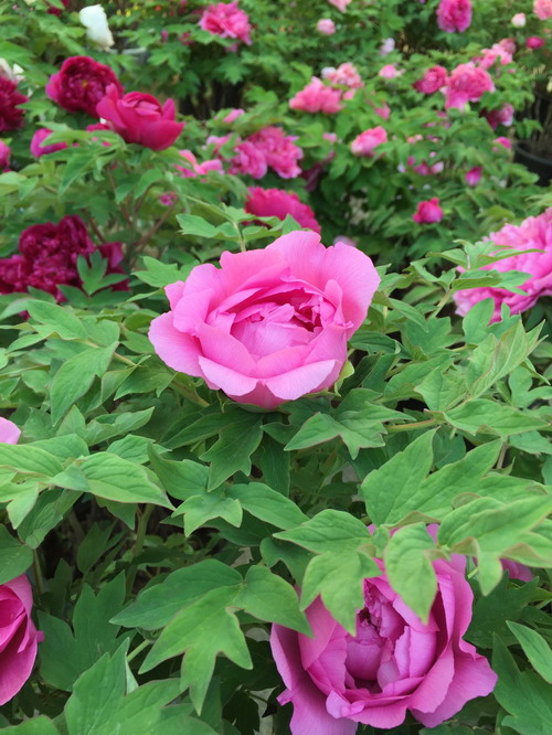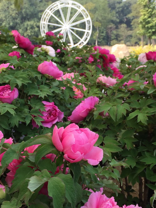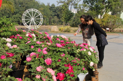 喜逢羊年新春,万株洛阳牡丹南下羊城,2015年春节牡丹风情节在华南植物园举行。此次牡丹风情节荟集了红、紫红、粉、蓝、白、绿、黄、黑、复色等九大色系、六大花型,约100个品种一万余株,其中国外品种40个。除了较为常见的洛阳红、胡红等品种外,绿色的豆绿,黄色的姚黄、蓝色的菱花湛露、黑色的青龙卧墨池、冠世墨玉、红色的太阳、花王等都是难得一见的珍稀品种。而复色的二乔、岛锦及一株树上开数种花色的什锦牡丹更是稀有。大树牡丹,高达1.5米,气势宏伟,树龄长达30年,一株树开花多达80朵,即使在牡丹之乡洛阳,这样的老树也不多见。