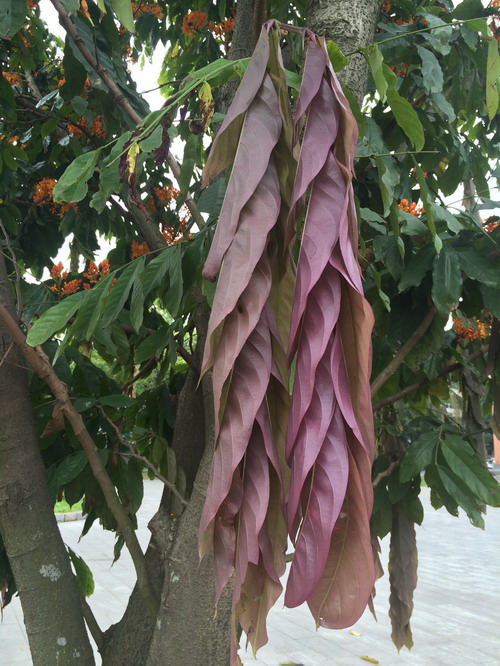 有趣的是,无忧树的叶是羽状复叶,嫩叶刚出时,由于叶柄柔软无法支撑叶片,深紫色的嫩叶呈下垂状,宛如被雨打湿了的紫红色的僧人的袈裟。