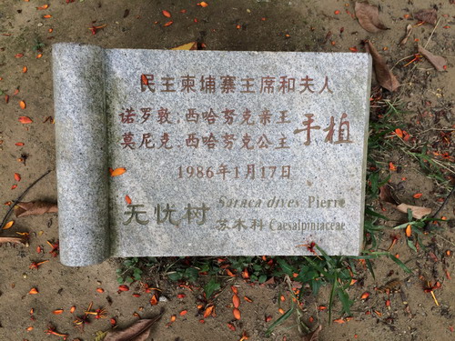 华南植物园名人手植树区内的几株无忧树都是名人亲手种植。其中一株是由柬埔寨前国王西哈努克及夫人在1986年3月亲手种下,当时饱尝战乱之苦的西哈努克风趣地说:“希望我们国家解放以后,也像你们一样过上无忧无虑的生活”,如今他种下的无忧树已花繁叶茂,他的国民也逐渐过上了安康的生活。这株已有29年树龄的无忧树被广州市政府定为“古树名木”加以保护。