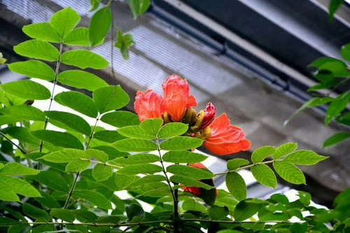 火焰树(Spathodea campanulata),又名火焰木、苞萼木,为紫葳科火焰树属常绿大乔木。株高10-20米,树干通直,灰白色,易分枝。叶为奇数羽状复叶对生,连叶柄长达45厘米;小叶13-17枚,叶片椭圆形或倒卵形。花大,聚成紧密的伞房式总状花序;花萼佛焰苞状,长5-10厘米;花冠钟状,一侧膨大,长3-5厘米,直径5-6厘米,红色或橙红色,中心黄色,有纵皱。花期3-6个月。蒴果长圆状棱形,果瓣赤褐色,近木质。种子有膜质翅。火焰树常用作行道树,也适宜公园、社区、旅游区等地种植。