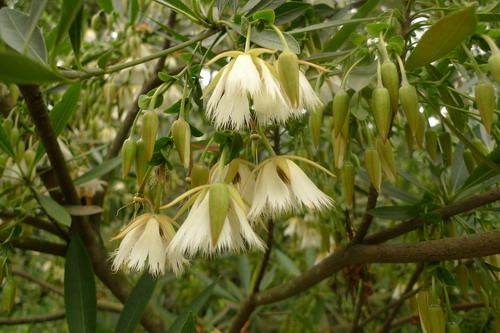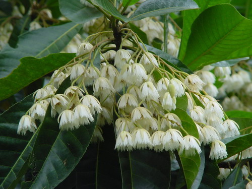 这种有着别样美丽的花儿叫做尖叶杜英(Elaeocarpus apiculatus Mast.),是杜英科(Elaeocarpaceae)杜英属的植物。它四季常绿,树形如塔,颇为壮观。叶甚大,革质,倒卵状披针形。而层层伸展的枝条,粗壮的胸径(可达2m),挺拔的板状根,发达的根系则可帮助它躲过东南沿海的狂风暴雨。