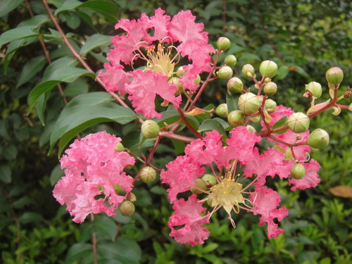 人们常说:“花无百日红”,而紫薇则是例外。紫薇花开时满树艳红,花期长达4个月,从夏至秋,花开不断,故名百日红。紫薇树干光滑,用手触摸,虽无风却可见树身轻摇,有如人怕痒态,故又称痒痒树。